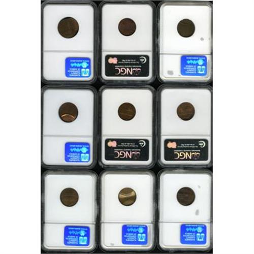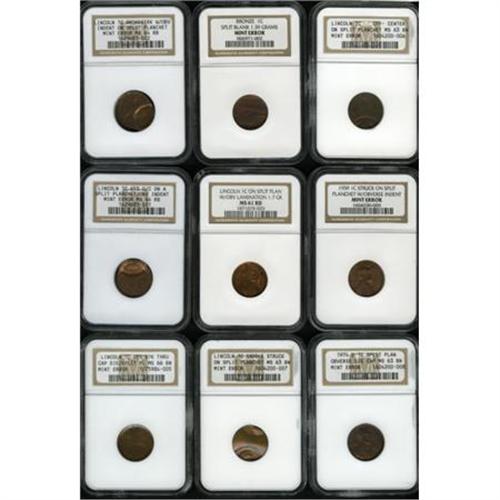 <B>Nine NGC-Certified Lincoln Cent Mint Errors.</B></I> The lot includes: <B>Undated Wheat cent--Off Center on a Split Planchet--MS63 Brown NGC,</B></I> the planchet split prior to the strike on the obverse side, 80% off center toward 6 o'clock; <B>1959--Struck on Split Planchet With Obverse Indent--Ungraded NGC,</B></I> softly struck, 10% indent at 12 o'clock; <B>1974-D--Split Planchet Obverse Die Cap--MS63 Brown NGC,</B></I> the flan split after the strike, relatively deep die cap obverse; <B>Unstruck bronze cent--Split Blank--Ungraded NGC,</B></I> 1.39 gm;<B>Undated cent--Split Planchet with Obverse Lamination--MS61 Red NGC,</B></I> 1.7 gm, split prior to the strike, softly struck, large shelf-like obverse lamination; <B>Undated cent--Saddle Struck on Split Planchet--MS63 Brown NGC,</B></I> a mark is noted on the central unstruck portion; <B>Undated cent--65% Off Center on a Split Planchet with Obverse Indent--MS64 Red and Brown NGC,</B></I> the indent occupies most of the struck portion of the obverse, the planchet split on the obverse side; <B>Undated cent--Broadstruck with Obverse Indent on a Split Planchet--MS64 Red and Brown NGC,</B></I> planchet split on obverse side, 40% indent at 1 o'clock, a scratch near LIBERTY; and an <B>Undated cent--Obverse Strike Through Cap Die, Split Planchet--MS66 Brown NGC,</B></I> obverse shows blurry elements of both designs.<BR><BR><B>Coin Engraver:</B> Victor D. Brenner<BR><BR><b>Shipping:</b> Coins & Currency (<a target="_blank" href="http://www.heritageauctions.com/common/shipping.php">view shipping information</a>)