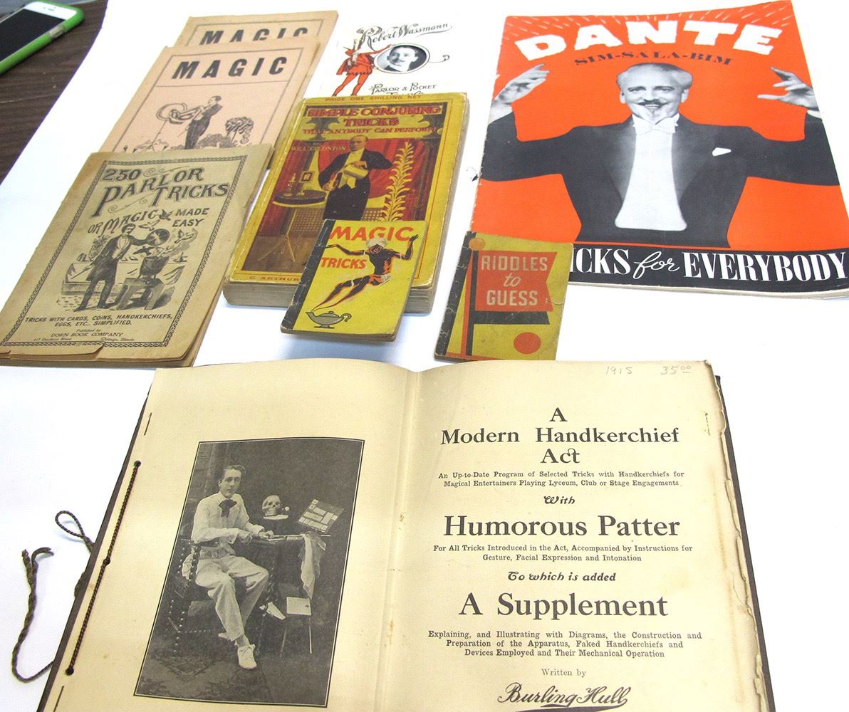 1938 Magic Tricks, Tricks and How to Do Them, small book. 1938 Riddles to Guess, small booklet. Simple Conjuring Tricks by Goldston 1913 124pp. El Modern Handkerchief Act with Patter, Parlor and Pocket Tricks by Wassmann 15pp. 250 Parlor Tricks or Magic Made Easy booklet. 1915 A Modern Handkerchief Act by Hull, bound 33pp. 2 vintage magic booklets. Dante 50 Tricks for Everybody. c. 1940's 24pp magazine. Date: Location: HWAC # 54943