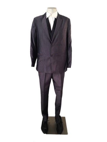 Male Dancer (James Rees) screen worn outfit, including: 2 pc.charcoal 'Belstaff' suit, cream colored long sleeve formal shirt, black cloth tie, 'Topman' black lace-up dress shoes (44), black leather belt, 'Persol' sunglasses with case, and stainless steel cufflinks. The dancer's name has been written into the outfit by the costume department. Condition may vary slightly.
