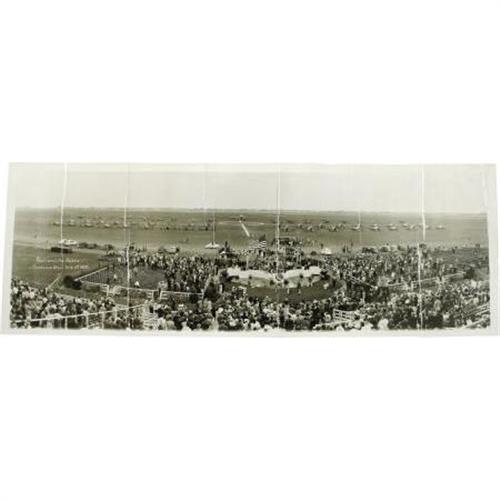 <B>Nine Panoramic Views of 1930s Air Races.</B></I> A lot of nine panoramic photographs in various sizes that include images of crowd scenes, grandstands, aircraft, etc. There are some duplicate images. The photographs appear to be from the Los Angeles and Cleveland National Air Races of the early 1930s. All photos have been stored in the rolled up position and as is frequently the case with these “yard long” photos there are some tears, wrinkles, large chips and brittleness present on many of the images, else in good condition. <I>From the collection of Cliff Henderson.</B></I><BR><BR><b>Shipping:</b> Flat Material, Large (<a target="_blank" href="http://www.heritageauctions.com/common/shipping.php">view shipping information</a>)