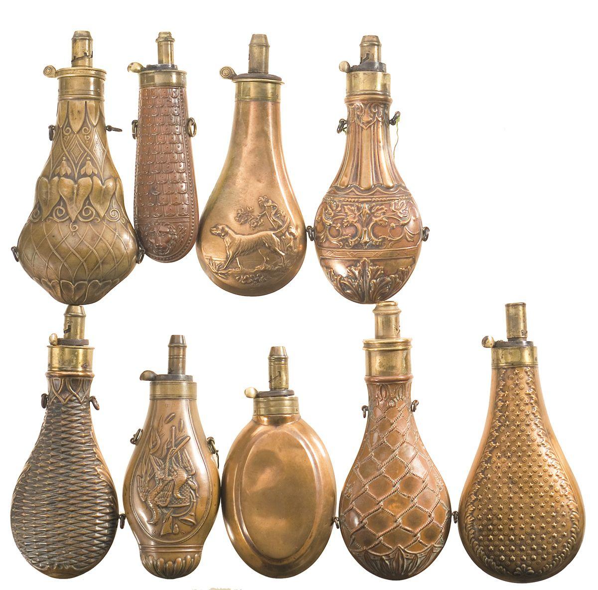 Contains 9 brass powder flasks with 8 having an ornate design and 1 being plain (couple large dents). Unless noted flasks are very good with some minor dings.