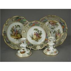 Nine pieces of Helena Wolfsohn dessertware, decorated in polychrome with courting couples, blue crowned 'D' mark Est. 130/180