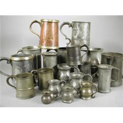 Nineteen 19th and 20th century pewter tankards, sized including quarts, half pints, gill, half an...