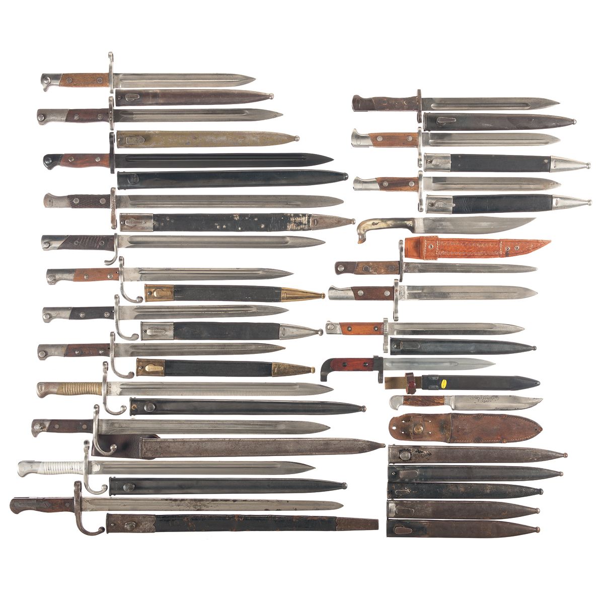 Lot includes 2 Toledo bayonets, 3 German bayonets, 2 knives and 5 loose sheaths. All fair or better.