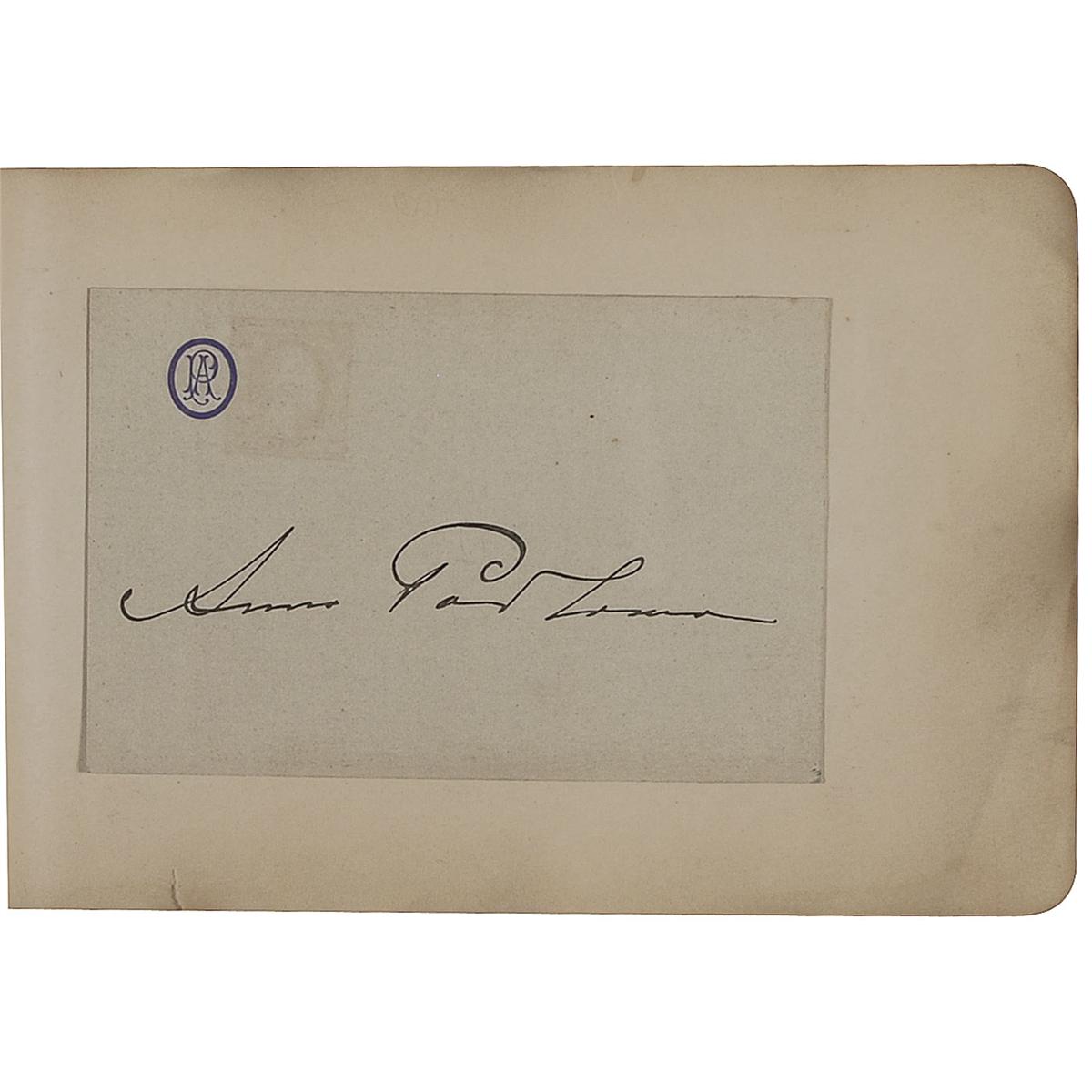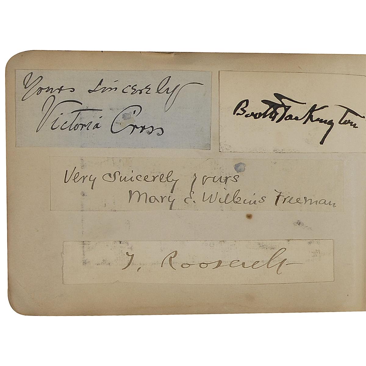 Expansive hardcover autograph album, 7.75 x 5, and measuring an impressive 4.5 inches thick, containing 252 signatures of politicians, notables, authors, artists, and stars of the stage and screen. Signatures are on affixed clipped slips, cards, trimmed photos, and ALSs and TLSs (most with their original mailing envelopes), with some pages bearing multiple signatures, with just about all back-to-back as well. Signers include: George Ade, Viola Allen (2), Pasquale Amato, Edwin Arden, George Arliss, Harry A. Bailey, Ernest R. Ball, John Kendrick Bangs, Ted S. Barron, Blanche Bates, Richard Bennett, Sam Bernard, Holbrook Blinn, Mary Boland, William Booth, William A. Brady, Donald Brian (2), Earle Browne, Edmund Bruce, Albert Bruning, William Jennings Bryan, Billie Burke, Beatrice Campbell, J. G. Cannon, Richard Carle (2), Robert W. Chambers, Charles Cherry, Howard Chandler Christy, Winston Churchill (writer), Marguerite Clark, George M. Cohen, William Collier, Constantino, Leo Copeland, William Courtenay, Jane Cowl, William H. Crane, Henrietta Crosman, Victoria Cross, Walter Damrosch, Hazel Dawn, Countess Thamara de Swisrsky, Gaby Deslys (2), Emmy Destinn, Henry Dixon, John Drew, Walter Prichard Eaton, Robert Edeson, Thomas Edison, Julian Eltinge (Sketch), George “Honey Boy” Evans, Douglas Fairbanks (2), Dustin Farnum, Geraldine Farrar, William Faversham (2), Elsie Ferguson, Lew Fields (2), Harrison Fisher, James Montgomery Flagg (2), Justin Miles Forman (2), Justus Miles Forman, John Fox, Jr., Mary E. Wilkins Freeman, Daniel Frohman, Johanna Gadski, Mary Garden, Charles J. Gebest, Adeline Genée, Grace George, Charles Dana Gibson (printed sketch), Charles Dana Gibson, C. Allen Gilbert, William Gillette, Lulu Glaser, Nat C. Goodwin, Helen Miller Gould (AQS), Fredrick Grant, Anna Katharine Green Rolphs, Herbert S. Hadley, Robert Haines, Sam H. Harris, Anna Held, Princess Helena, Victor Herbert (AMQS), Robert Hichens, Robert Hilliard, Raymond Hitchcock (11), Mabel Hite and Mike Doulin, William Hodge, Gertude Hoffman, Josef Hofmann, E. Burton Holmes, Anthony Hope, DeWolf Hopper, Henry Hutt (sketch), Isabel Irving, Elsie Janis, Theo W. Kelley (AMQS), Percival Knight, Henry Kolker, Wilton Lackaye, Lillie Langtry, Harry Lauder, William J. Locke, Hewey Lodge, Jack London, Harold MacGrath, Louis Mann, Mary Mannering, R. B. Mantell, Marceline, Julia Marlowe, Tully Marshall (2), John Mason, Edith Wynne Matthison, Bruce McRae (6), Henry Miller, George Monroe, Gouverneur Morris, Maurice Mouvet, Tim Murphy (Sketch), George Nash, Nazimova, Olga Nethersole, Fred Niblo, Julia Nielson, Lillian Nordica Young, Chauncey Olcott, E. Phillips Oppenheim, Anna Pavlova, Robert E. Peary, William Peck, Pol Plancon, Channing Pollock, Guy Bates Post, James Powers, James Whitcomb Riley, Blanche Ring, Theodore Roosevelt, Lillian Russell, Julia Sanderson, Henry W. Savage, Fritzi Scheff, Ernestine Schumann-Heink, Jean Schwartz (AMQS), A. Scotti, Marcella Sembrich (2), Ernest Seton, Upton Sinclair, Otis Skinner, Francis Hokinson Smith, E. H. Sothern, Ruth St. Denis, F. Pope Stamper, Frances Starr (2), Julian Street, Mabel Taliaferro, Booth Tarkington, Marie Tempest, Luisa Tetrazzini, Katherine Cecil Thurston, Louis Tracy, Louis Joseph Vance, Marilyn Walker (AQS), Blanche Walsh, Helen Ware, David Warfield, H. B. Warner (7), Kate Douglas Wiggin, Harry Williams, Francis Wilson, Leonard Wood, Frank Worthing, Olive Wyndham, and Cecil Yapp (2).