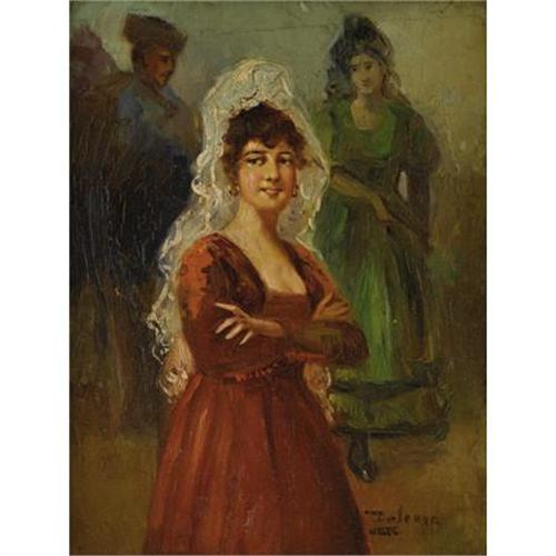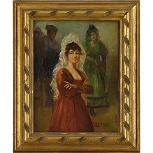 <B>NINETEENTH CENTURY SCHOOL</B></I><BR><I>Spanish Beauty</B></I><BR>Oil on canvas<BR>9 x 11 inches (22.9 x 27.9 cm)<BR>Signed at lower right<BR> <BR><BR><b>Shipping:</b> Requires 3rd Party Shipping (<a target="_blank" href="http://www.heritageauctions.com/common/shipping.php">view shipping information</a>)