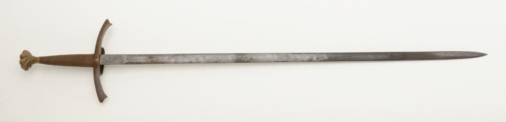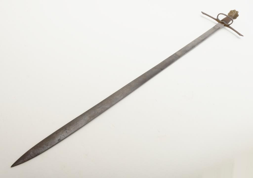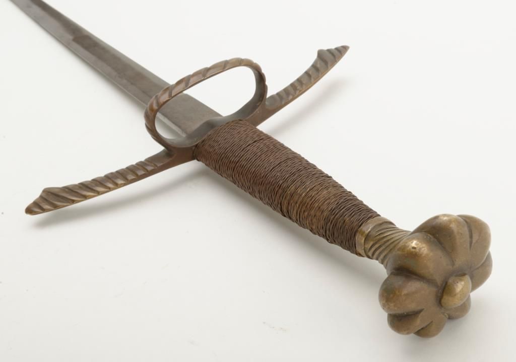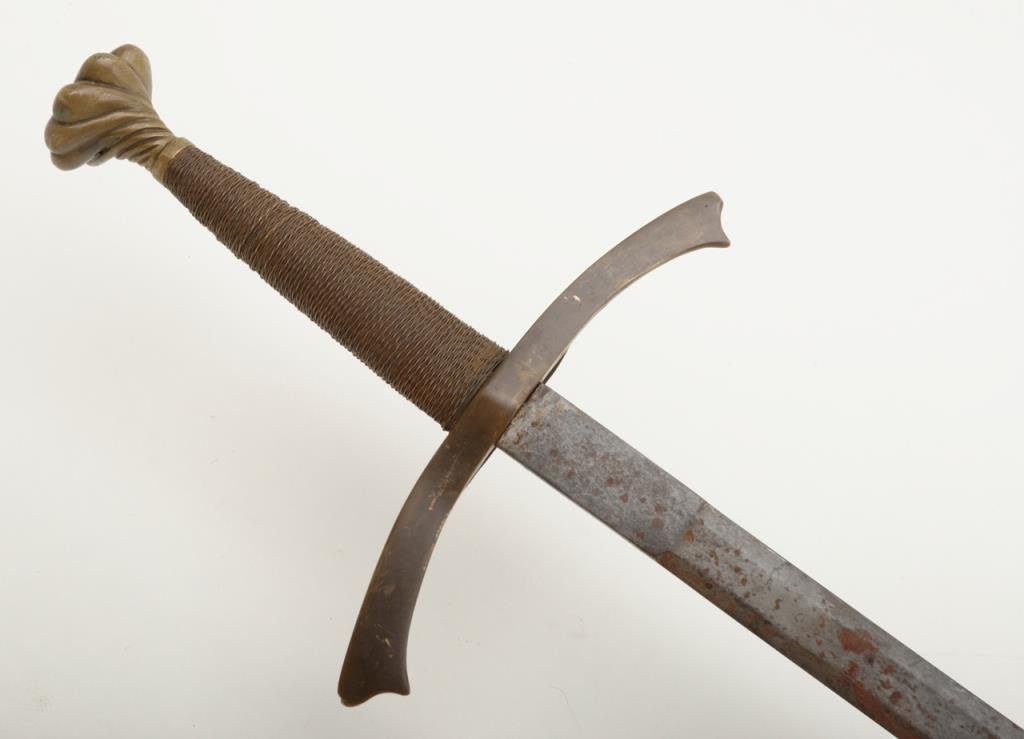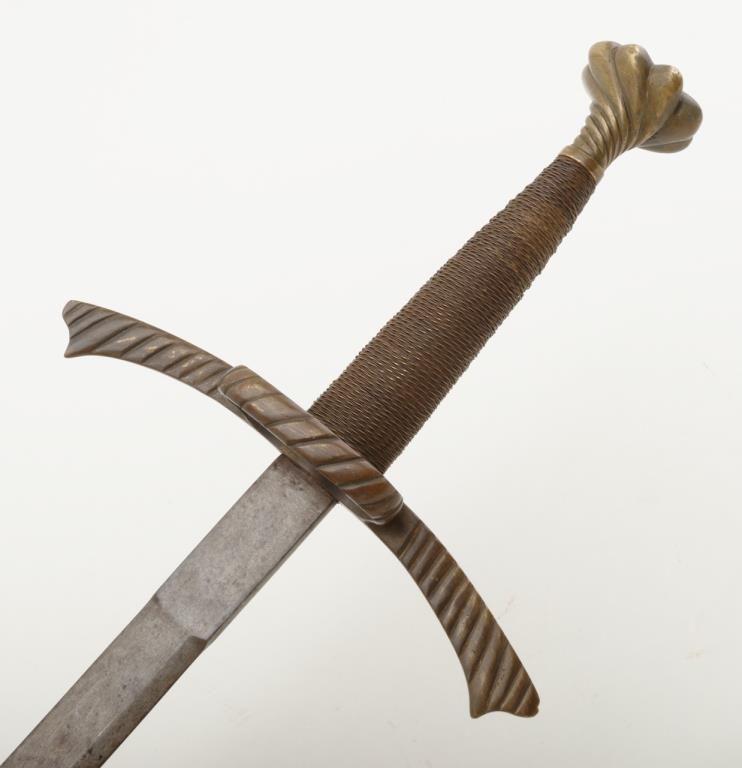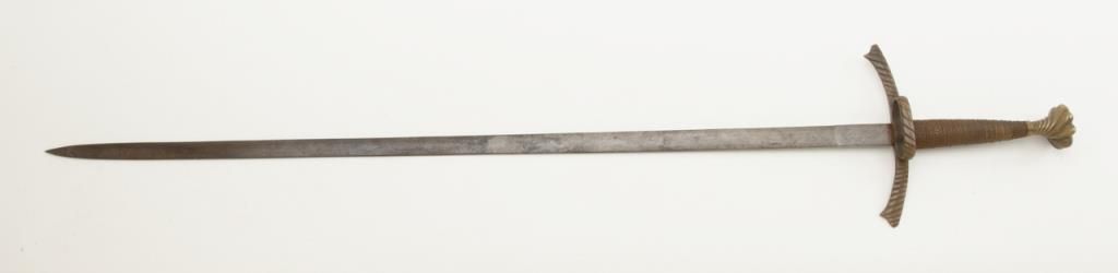 Nineteenth or Twentieth century copy of a Sixteenth sword with bronze hilt and pommel showing a pleasing patina; approx. 43” overall with a 35-1/2” blade. Est.: $100-$200.