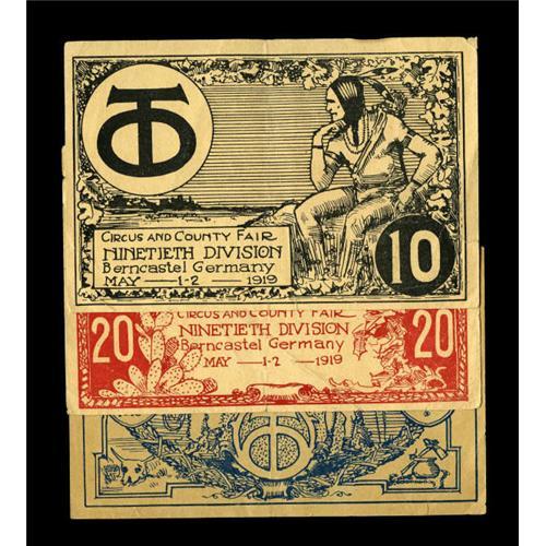 <B>Ninetieth Division- Berncastle, Germany 10; 20; 50 Teeohs May 1 -2, 1919.</B></I> The Ninetieth Division's troops were young men from Texas and Oklahoma. Their insignia is a monogram "TO." The Ninetieth served in France during World War One and then spent 1919 on occupation duty in Germany. To relieve the boredom of occupation duty this division held an American circus and county fair in the Fatherland. Currency for this event was denominated in "Teeohs" and the notes display cowboys and native Americans. This is the first time that we have seen more than a solitary piece from this little known event. The 10 Teeohs grades <B>VF </B></I>with an approximate half inch edge tear, the 20 Teeohs grades <B>VF </B></I>with tiny splits at both center top and bottom, and the 50 Teeohs grades <B>XF </B></I>with a few tiny edge splits.<BR><BR><b>Shipping:</b> Coins & Currency (<a target="_blank" href="http://www.heritageauctions.com/common/shipping.php">view shipping information</a>)