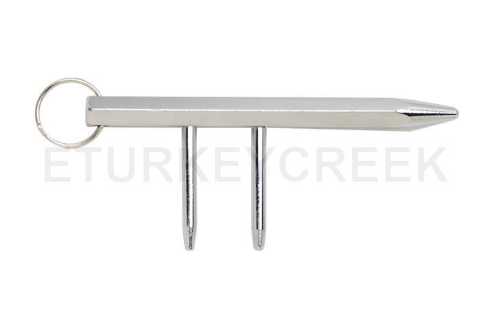 Ninja Keychain Kubotan is a kubotan with extra spikes extending from it. These spikes protrude through your fingers while you are holding it in your fist. This kubotan has a keychain ring for your keys so you will always have it with you. The ninja kubotan is made of metal.
