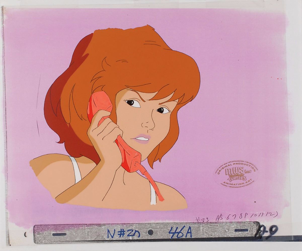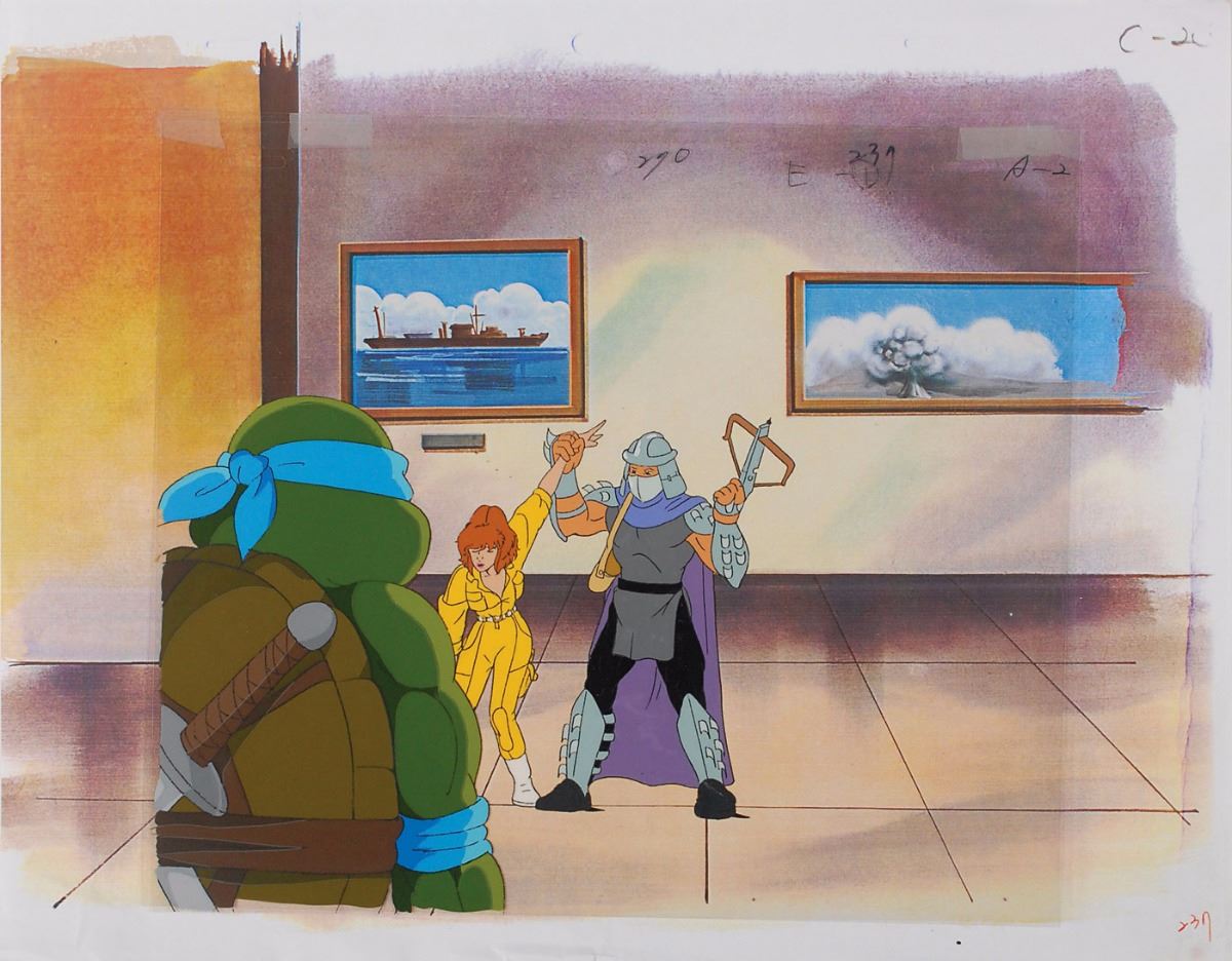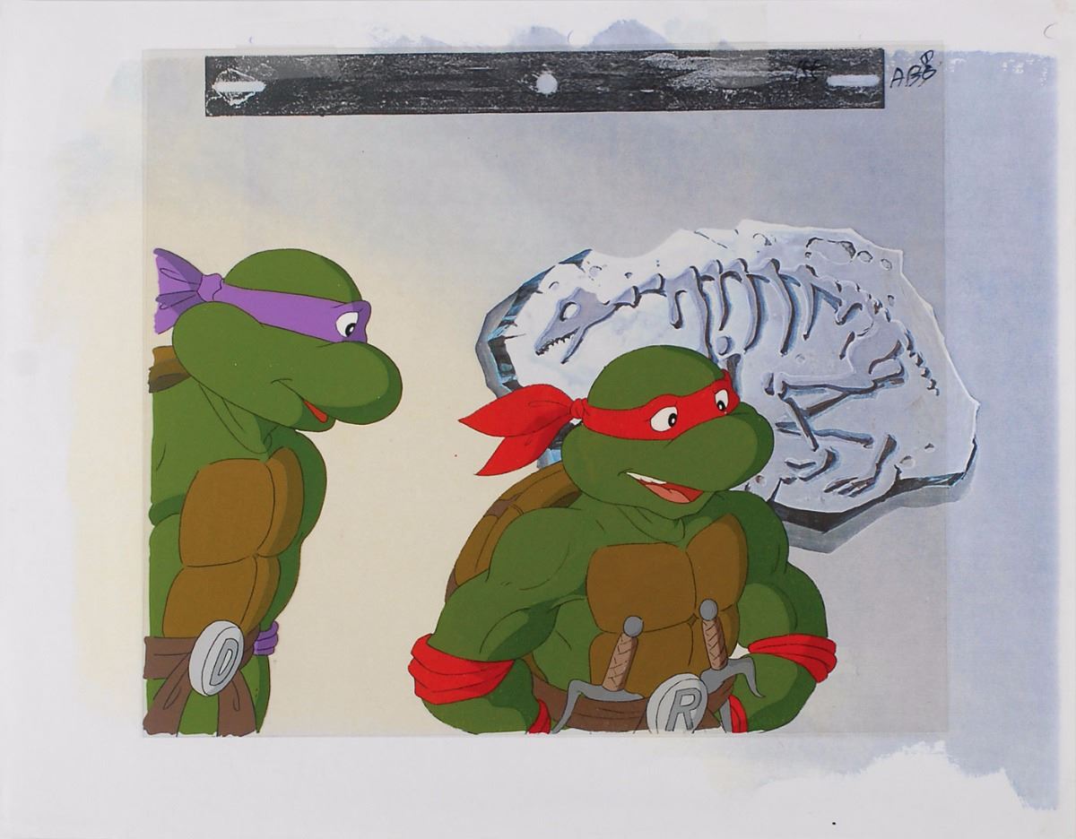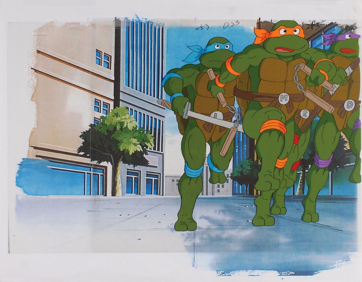 Four original hand-painted production cels for Teenage Mutant Ninja Turtles (Murakami-Wolf-Swenson, 1987) with character images measuring from 3 x 5 to 8 x 8, all set against color 14 x 11 pre-printed backgrounds. Cels depict: Michelangelo, ?Leonardo, and ?Donatello; Rafael and Donatello; April; and Leonardo, Shredder, and April. In overall fine condition.