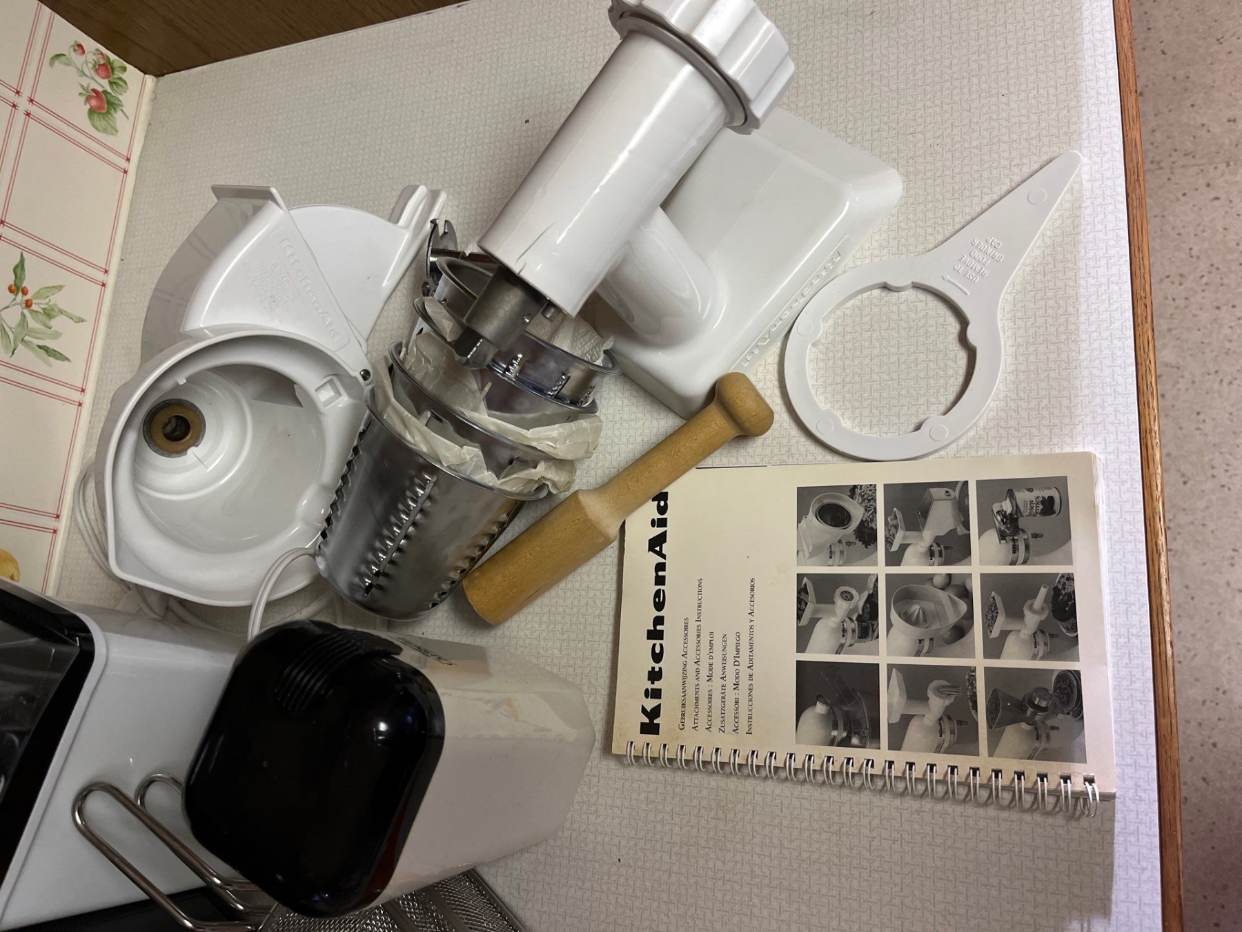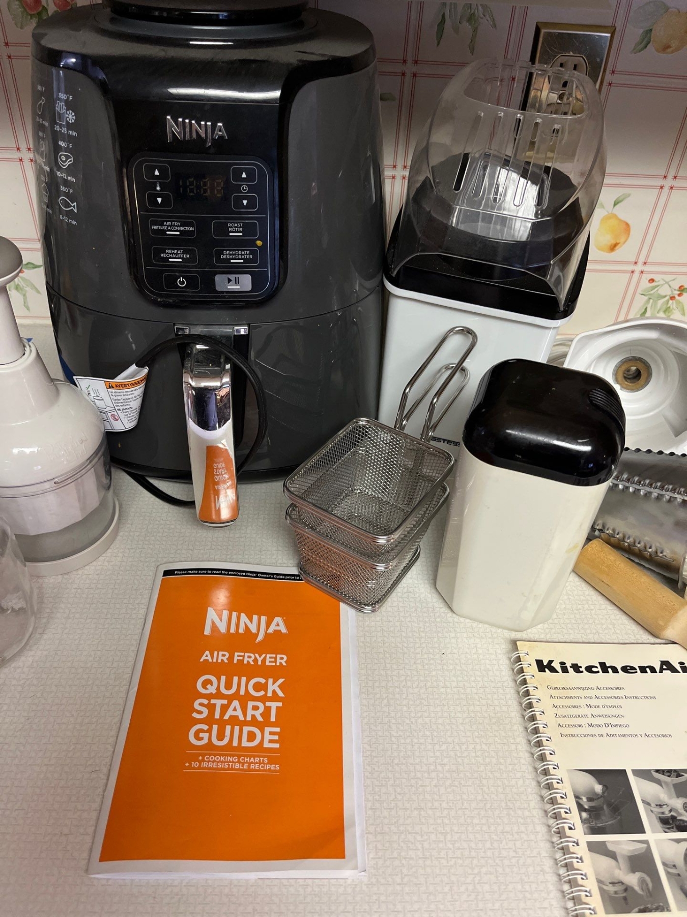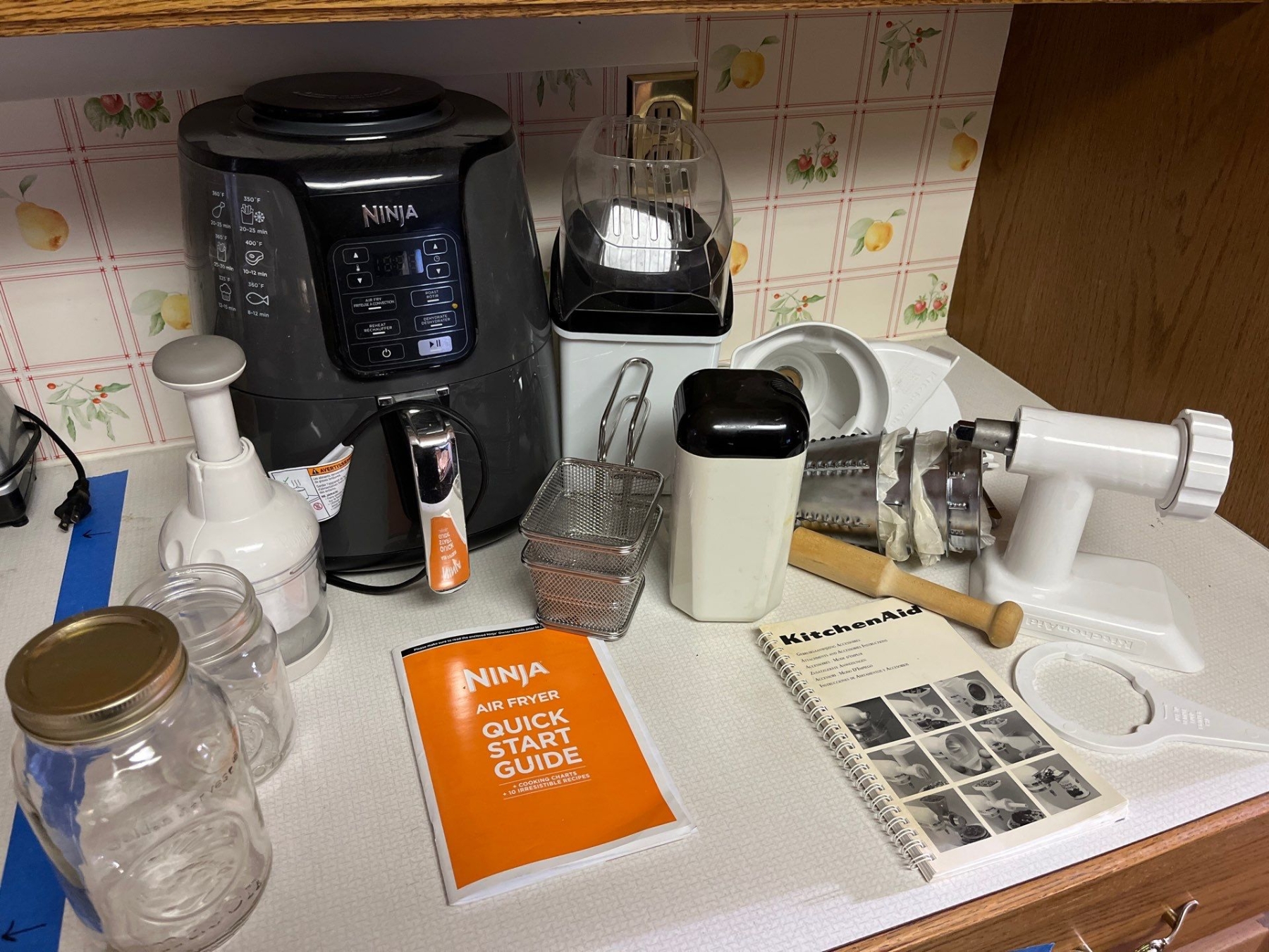 Ninja air fryer slap, chop KitchenAid attachments for grinding meat and grading cheese, café milk, coffee grinder, and a air pop popcorn popper
