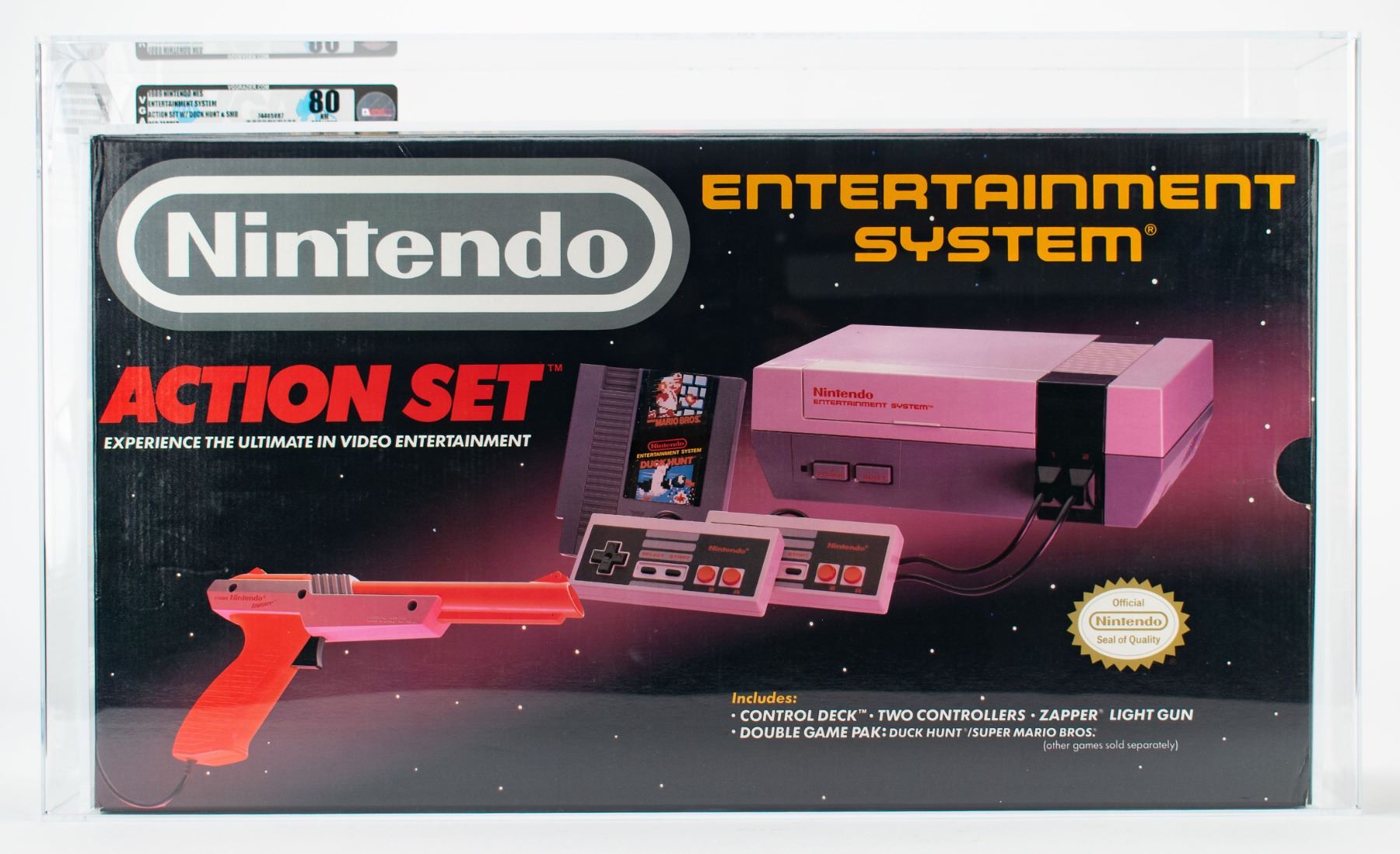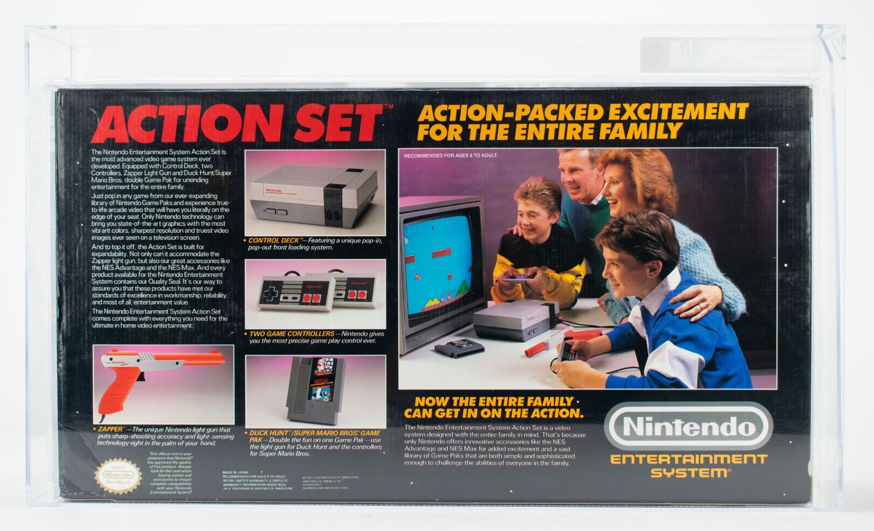 Original 1989 Nintendo Entertainment System (NES) Action Set in its original box, including the 'Control Deck' gaming console, two controllers, orange NES Zapper light gun, and Duck Hunt/Super Mario Brothers double game pack. Encapsulated and graded by VGA NM 80, with a crack to the side of the outer plastic case. The NES Action Set was the most popular bundle for the original Nintendo: when first released in 1985, it included a gray-colored Zapper that matched the console. After the the Federal Toy Gun Law was signed into United States law in 1988, toy guns were required to be visually distinct from real ones and the bright orange Zapper was introduced. The popularity of the set also resulted in the wide proliferation of the Super Mario Bros./Duck Hunt multicart game on the secondhand market, as compared to the standalone versions of each game.