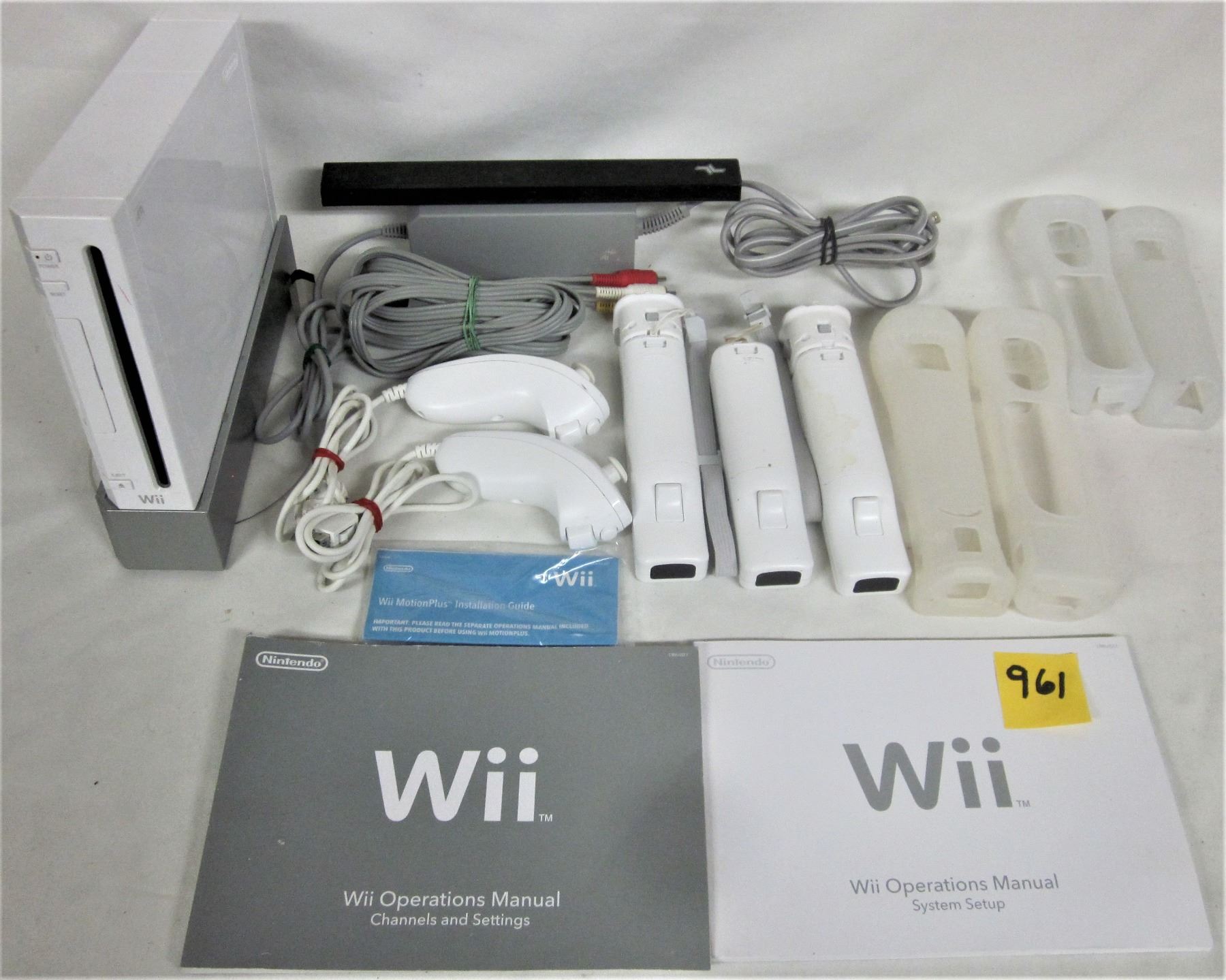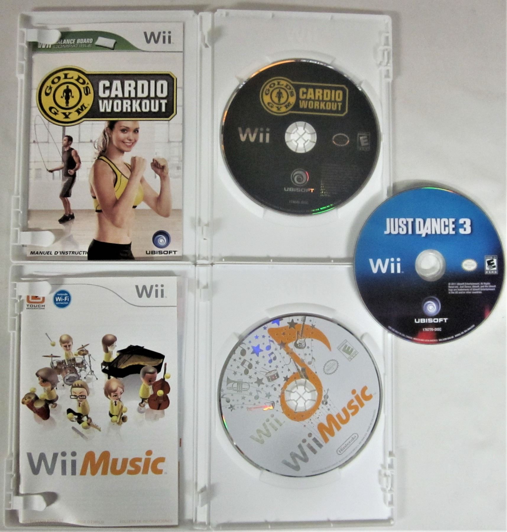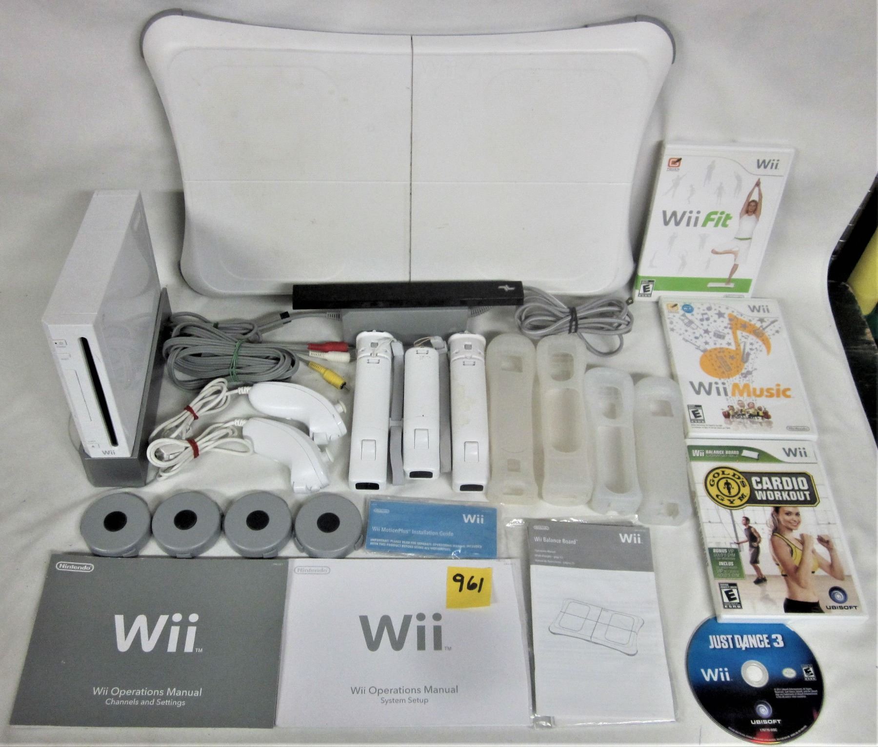 Console; Stand + Plate; AV Cables; AC adaptor; Sensor Bar; 2 x Nunchuk; 3x Controllers; 4x Controller Jackets; Manuals; Music Disk; Cardio Workout; Just Dance 3; WII FIT Balance Board + Disk