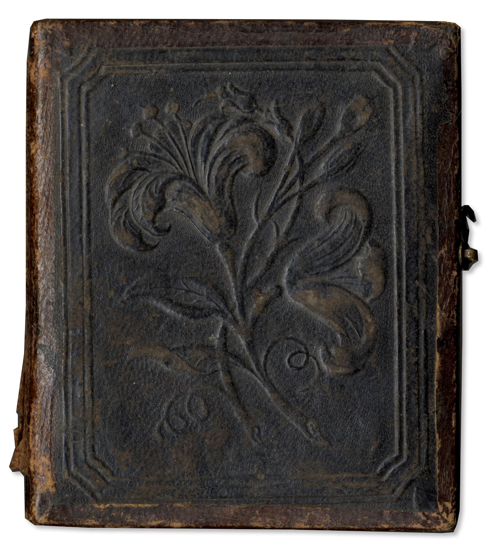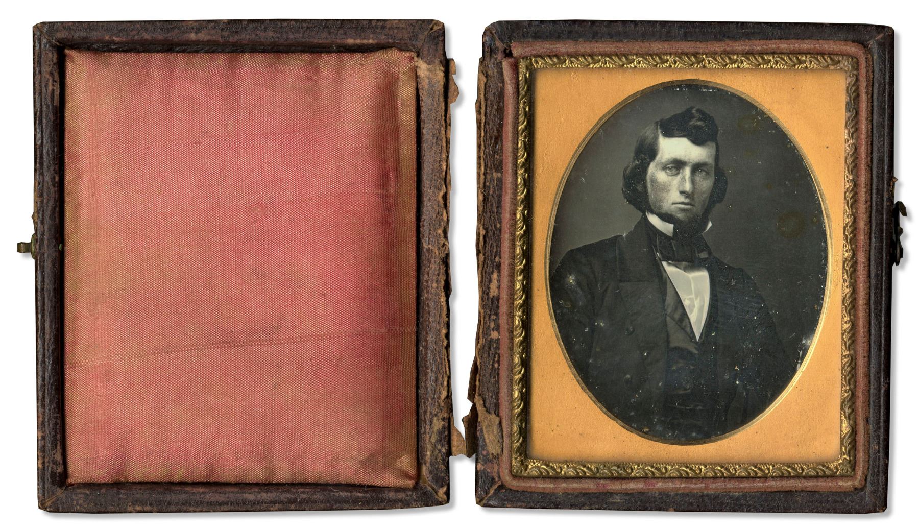 Rare ninth-plate daguerreotype of a handsome freckled man dressed in a period suit. Daguerreotype housed in a case, which is split. Some wear to edges. Some light spots on image. Separated full-case. Extremely sharp and clean.