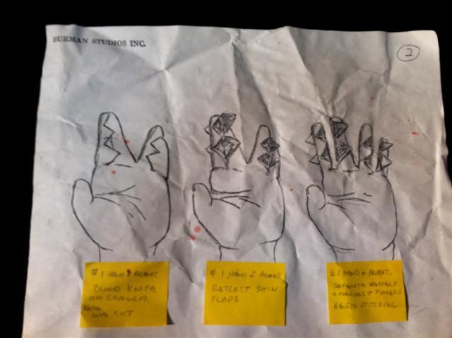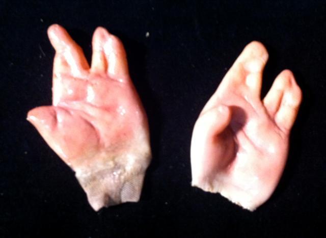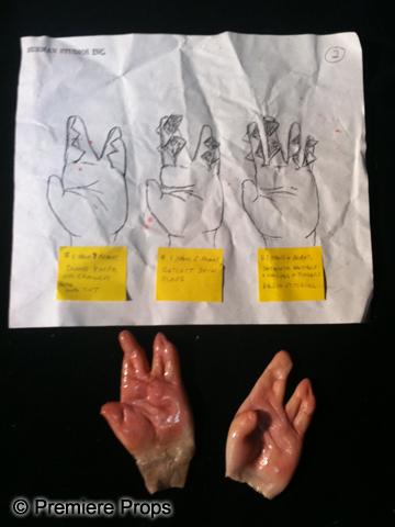 Nip/Tuck (2003-2010) - From the popular television show about two plastic surgeons, a pair of prosthetic baby hands with fingers fused together from the pivotal episode “Conner McNamara 2026” (Season 4, Episode 11) where Sean McNamara’s baby is born with this deformity. Also includes illustrated sheet with instructional post it notes. From the award winning Burman Studios. Hands are 2" x 3" each.