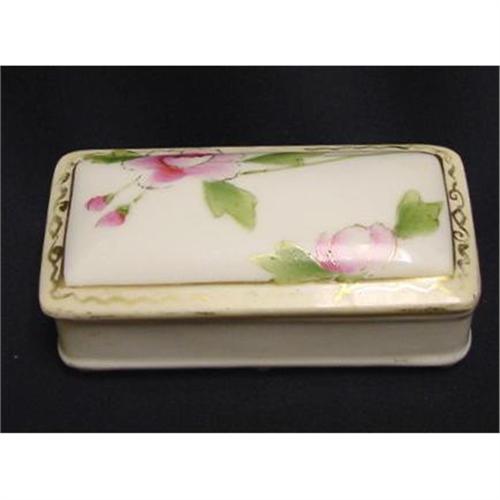Noritake Nippon 3-1/2" dresser trinket dish with lid, hand painted roses. There is some loss to the gold design along the edge of the lid. Six tiny feet with some gold loss.