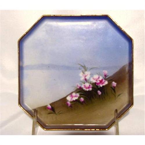 Lovely Nippon 5-1/4" square scenic handpainted pin tray. Very subtle scene of flowers along the bank of a lake with just a faint view of the mountains in the far background.