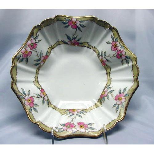Beautiful Nippon Morimura Brothers hexoganol scallop shaped 9-3/4" bowl, exquisite gold rim and beading and floral borders on the upper rim of the bowl as well as the lower inside portion of the bowl. The bowl is 3" deep. In wonderful condition, no chips, cracks, hairlines or beading missing. There are 2 glaze pops and one "pimple" on the inside of the bowl. But so very minor, barely noticable. Truly a wonderful find for the Nippon collector! C. 1920