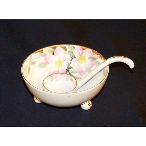 Ever popular Azalea pattern Nippon mayo bowl and ladle. The bowl is 4-1/4" in diameter. In excellent condition with no breaks, chips, nicks or hairlines.