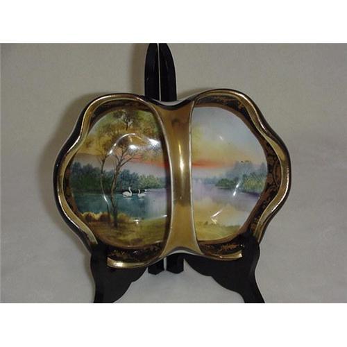 Hand painted Nippon basket. 7 1/4" long x 5 3/8" wide x 3 1/2" tall. Scene depicting swans on a lake.