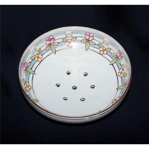 Nippon berry strainer bowl. Very pretty floral border painted inside the rim. The grid work behind the upper portion of the floral design is painted in gold.