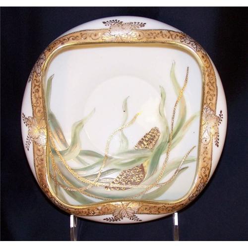 Nippon 7-1/2" bowl with corn stalk. The corn kernels are in relief. The gold threads running through the stalk is in raised design. All raised beading and design are intact. This is truly an exceptional piece!