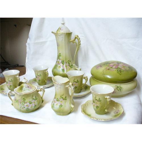 This Beautiful Chocolate Set comes with 4 cups & saucers,Choc. Pot, Cream & Sugar, & Biscuit Bowl ( Very Hard to Find )Set is in excellent condition and has no chips. Measurements are pot 10.5 x5.33, cups 3x3.25,saucer 4.9,sugar 4.5x7, creamer 4.25x3.25, biscuit bowl 4.5x7.25. pattern is handpainted dogwood with gold. This is a Breathtaking set. All are marked Nippon.