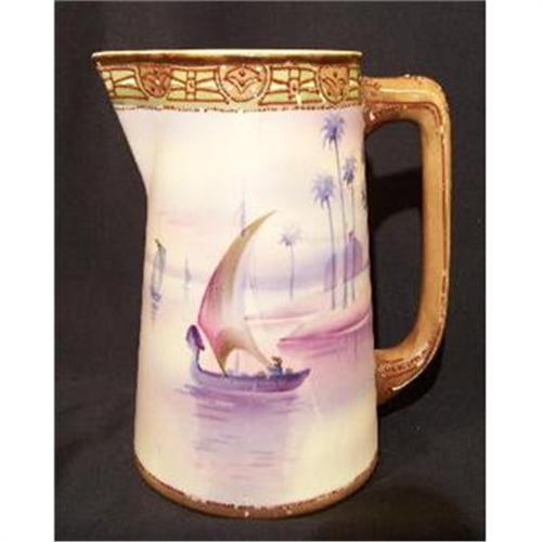 Nippon Cleopatra's Barge 5-1/2" Pitcher. This is one of the most popular of all the Nippon scenics. There are some of the beads missing (approximately 20%) and about 15% of the slip trail is missing. There are no chips, nicks, hairlines or cracks. There is one surface scratch on the paint on the main side. On the back side, there are a few pinpoint size spots of the brown paint in the scene, done in manufacturing.