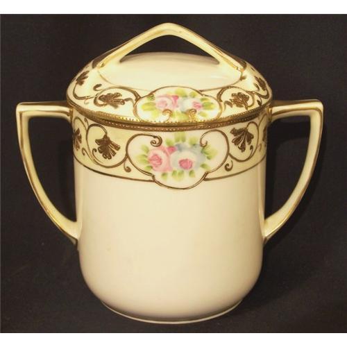 Lovely Nippon condensed milk jar with lid. All outlining is in raised told. The edge of the lid and the top edge of the jar have raised beads, all intact. Lovely cartouche with pink and blue flowers.