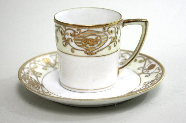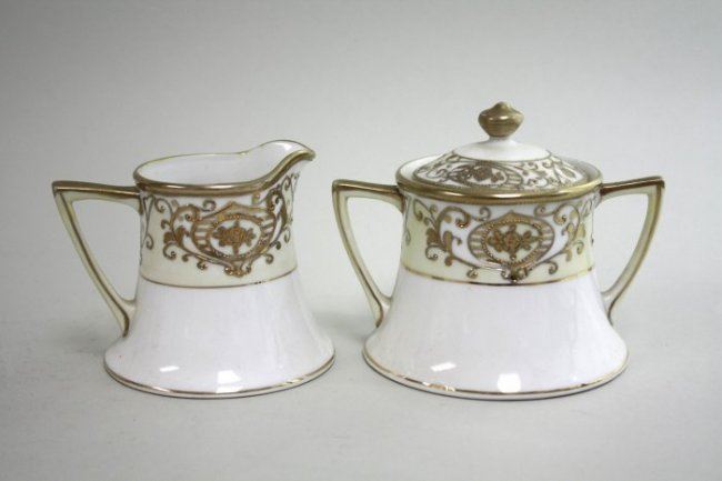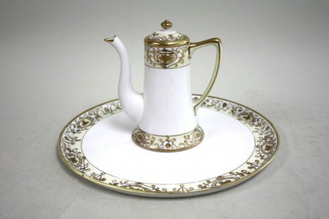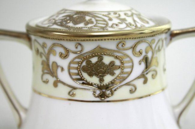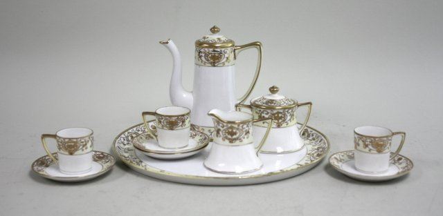 11 pieces including tray, teapot, creamer, sugar, 3 cups & 4 saucers. Loss to gilding.