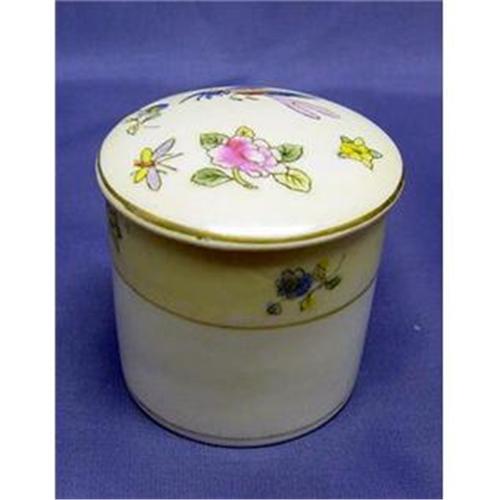 Nippon exotic bird lidded trinket jar 2" x 2". The colors are vibrant. In wonderful condition, with only a tiny bit of rubbing of gold. No cracks, chips or hairlines.