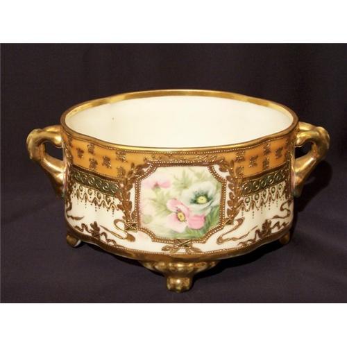 Absolutely stunning Nippon ferner measuring 9-1/2" from tip of handle to tip of handle and 4-1/2" high. There is a wide gold band around the top of the ferner, below that a 1" wide band in mustard color, another thin band of gold below that and then a jade green band. Within the bands are different raised gold designs. Below the bands are beaudiful beaded swags with jade green jewels. There are 4 insets with floral handpainted scenes. Lots of gold beading and raised gold outlining almost everything. This is an awesome piece, a real show stopper!