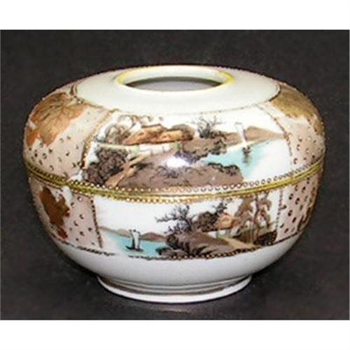 </font></strong>Produced in Japan, but not marked, during the early 20th century this Hand Painted white porcelain hair receiver, rimmed with gold Moriage beading and decorated, both base and lid, with alternating panels of Japanese landscapes and patterned panels of gold leaf, flowers and more heavy gold Moriage beading. Measuring about 4 inches in diameter x 3 inches tall and is in excellent condition</font>