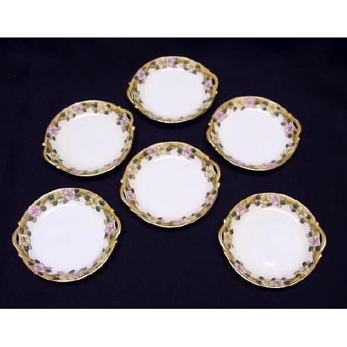 Gorgeous Nippon handpainted floral border butter pats measuring 3-3/4" in diameter. It has open handles. There is no loss of paint. Two of the pats have very minor scuff marks inside the white of the plate, 3 have pinpoint size pits and one has a tiny "pimple". This is a wonderful set of pats - one of the nicest I have ever seen with all 6 in the set. No chips, cracks or hairlines.