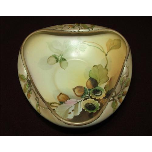 Beautiful Nippon handpainted tri-corner bowl with moriage beaded decoration, featuring an acorn and oak leaf design in subtle woodland hues. The interior background is in soft yellows, roses, and peachy tans. Green and brown acorns are handpainted on the background, along with muted green, brown, cream, and pink leaves and branches.<p>The triangular upper lip of the bowl is in a chocolaty taupe and is edged in dark brown moriage beads. On the 3 folded edges in slip relief are acorns, leaves, and branches in natural greens and browns. The exterior of the bowl fades from taupe to white, with a chocolate brown ring around the bottom edge. A green "Hand Painted NIPPON" and M in a wreath trademark is on the bottom.<p>The bowl measures approximately 2.75 inches high, 7.75 inches wide, and 8 inches deep. It is in very good to excellent condition, with no chips or cracks, and minimal surface wear. The moriage beads are intact, with the exception of 1 - 3 tiny beads. Please refer to the 4 photographs for appearance and condition. Shipping / packaging will be $10.00.