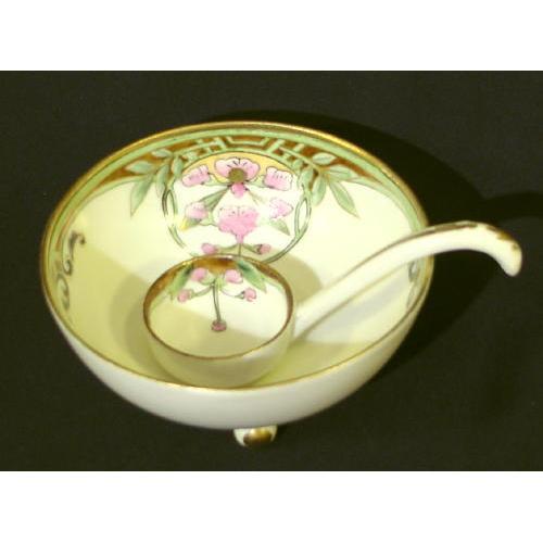 Lovely Nippon Meito mayo or whipped cream bowl with ladle. Slight Art Deco floral design.