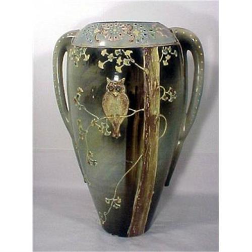 Here is quite the spectacular Nippon vase. It is elaborately decorated with moriage slip work. The owl and tree trunk is a very heavy slip applied or molded in design. It has two handles with a decoration of the slip moriage beads all the way down the handle. The color is an overall naturalistic pale grayish bluish with a brown owl and tree trunk. The trailing leaves of the tree and branches are a fairly naturalistic color of yellow and green and a long the top front of the vase is heavy applied moriage slip decorations in contrasting colors of pink, green, blue and yellow. It is in a very nice shape for this impressive sized vase. I believe the condition is good ? it has some firing blips. There is a crack on the top of the right handle that looks like either a firing crack or an old repair ? I?m not quite sure ? it is an excellent job and quite faint whatever it is. Overall it is quite a statues vase. Marked on the bottom is a heart with the letters ESO and underneath of that written in script Hand Painted Nippon and I would guess that the color is green for that. It measures 14 ¾?h x 10? at widest with the diameter of the base 3 7/8?.