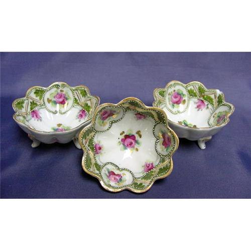 Beautiful Nippon footed nut cups (3). Predominate color is green with medallions of roses. Wonderful white beading outlines the medallions and the outline green lines.
