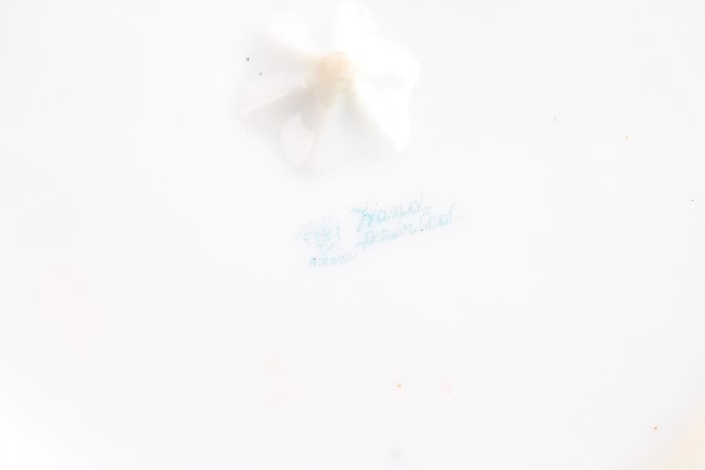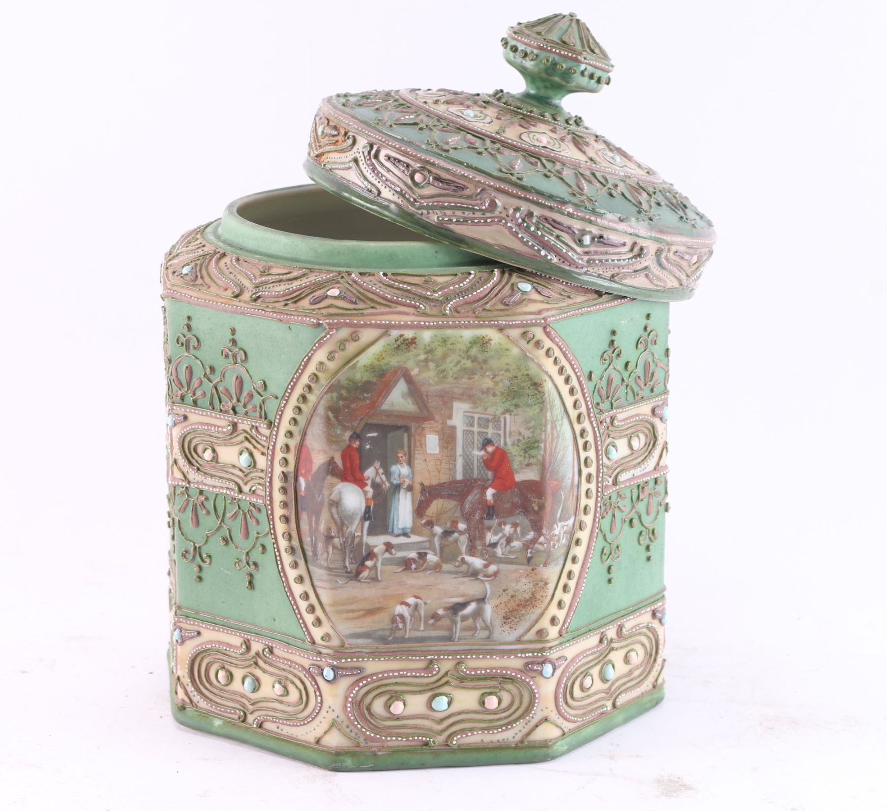 Hand-painted. Fox hunt scene with raised and ornate decoration. 8 1/4" tall. Near fine condition.