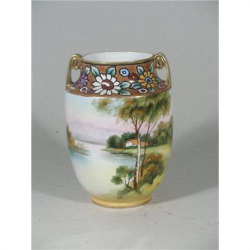 Nippon Porcelain Vase, Early 20th c. - Handpainted with landscape scene, wide band of stylized flowers to top with applied gilded handles. Bottom is stamped "Hand Painted Nippon". 7" high