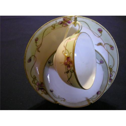 This set is in amazingly well-preserved condition. The teacup stands at 1.75" and is 3.25" in diameter at the rim. Lovely violet floral design against a white and pale green background. Characteristic Nippon beading in gold, on rim of teacup, saucer and dessert plate, as well as accenting in gold. This set would be a wonderful addition to a collection.