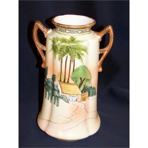 Nippon 8" vase with barnyard scene. Slip trail and beading on the handles and beading around the neck.