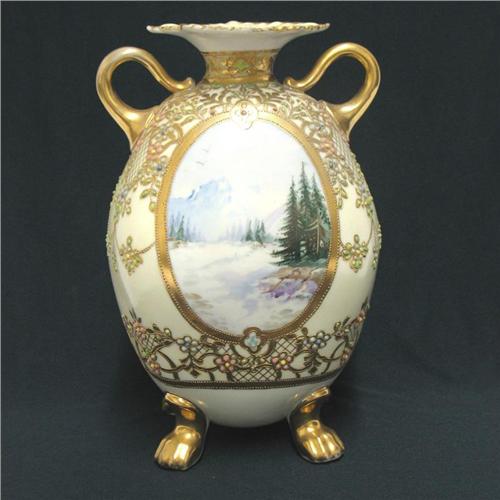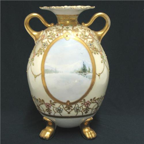 Nippon handled vase with four paw feet; gilt enameled and jeweled decoration with hand painted landscape scenes in center medallions; late 19th to early 20th C.; 10" high; no visible defects