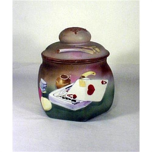This is an absolutely wonderful and exciting Nippon find! It is a humidor with highly raised enamel of a deck of playing cards, a pipe, and poker chips. On the lid you have cigarettes and stick matches in highly raised enamel - even the little blue tips of the stick matches are highly raised. Inside the lid it has the original sponge to keep the tobacco moist. I think it is a great piece. The condition is very good! It is marked on the bottom Hand Painted Nippon with the M inside the Wreath in green. There is a similar example of this piece in the book Collector?s Encyclopedia of Nippon Porcelain ? Identification and Values by Joan F Van Patten on page 87. They are part of the Playing Card Décor ? which is generally found on humidors, smoke sets, mugs and plaques. These pieces carry the green # 47 mark which is on page 145 and reads as follows: M-in-wreath, Hand Painted Nippon (M stands for importer, Morimura Bros.); found in green blue, magenta, and gold colors. Mark used since 1911. If you are a collector of humidors, tobacco or smoking memorabilia not to mention Nippon I would say that this is a must have for your collection! It measures 5 ½? at highest x approx 5 ½? in overall diameter.