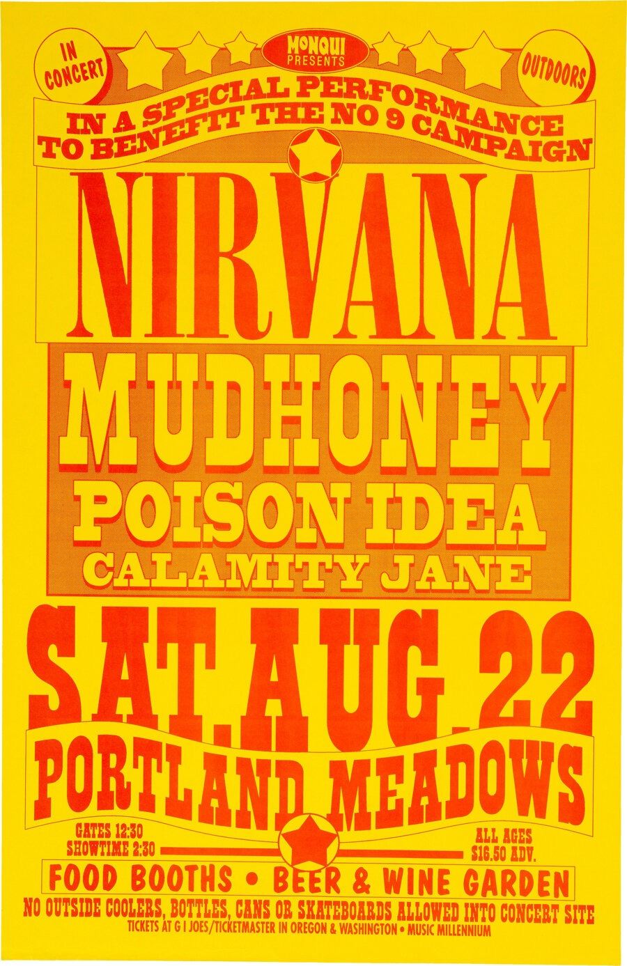 Nirvana 1992 Portland Meadows Concert Poster Signed by Designer Mike King.A poster for a show that ended up being rescheduled due to the birth of Kurt Cobain's daughter, Frances Bean, on August 18th. This show was scheduled for August 22 at Portland Meadows, but it was rescheduled for September 10th, right after the band played the MTV Video Music Awards (the show where they began their performance with a then-unreleased "Rape Me" and bassist Krist Novoselic hit his head with his bass). For the show that ended up happening in September, Helmet played in place of Mudhoney.