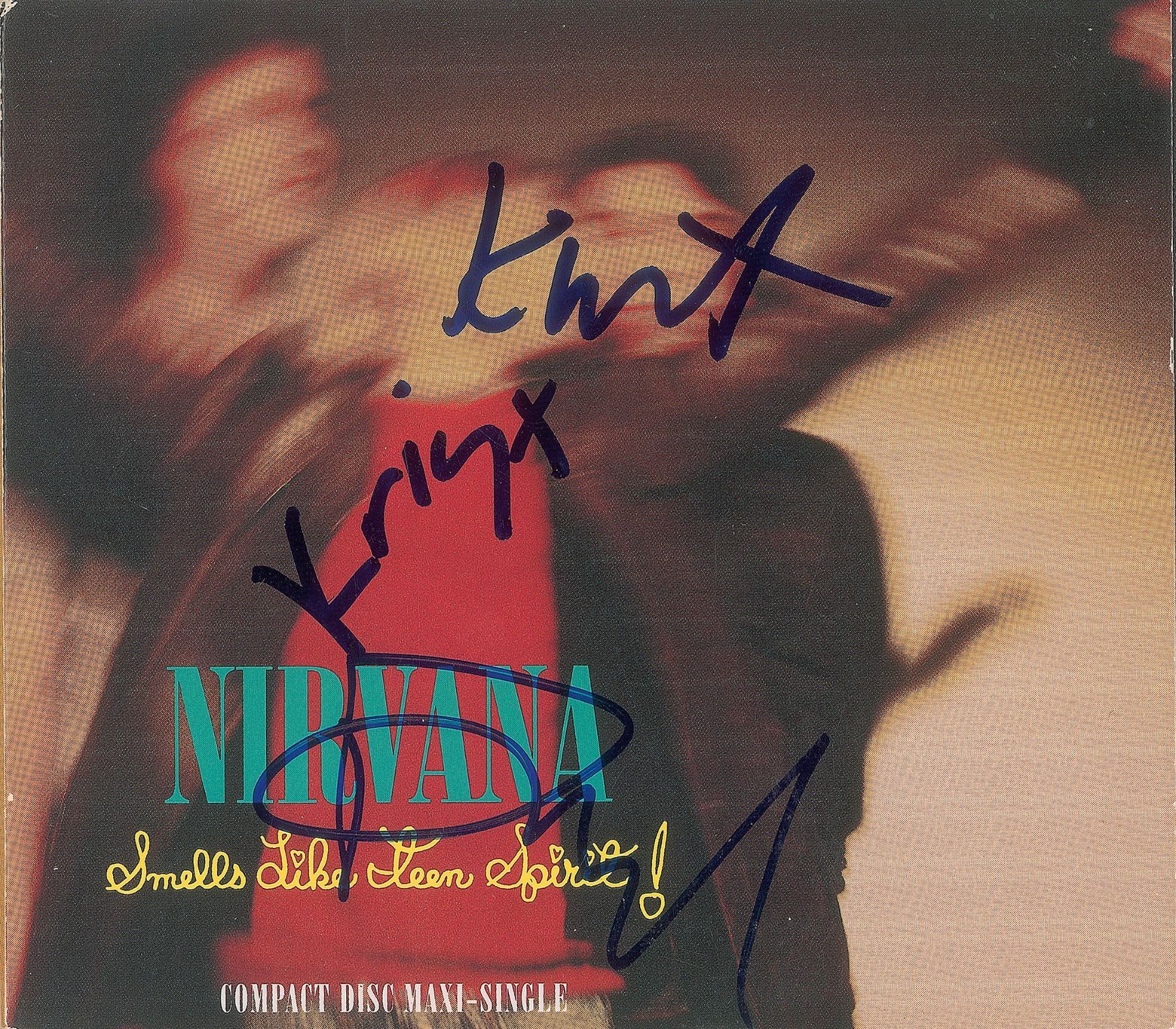 Smells Like Teen Spirit maxi-single CD by Nirvana CD signed on the front cover in blue felt tip, "Kurt," "Krist," and "David." In fine condition. The CD is included.