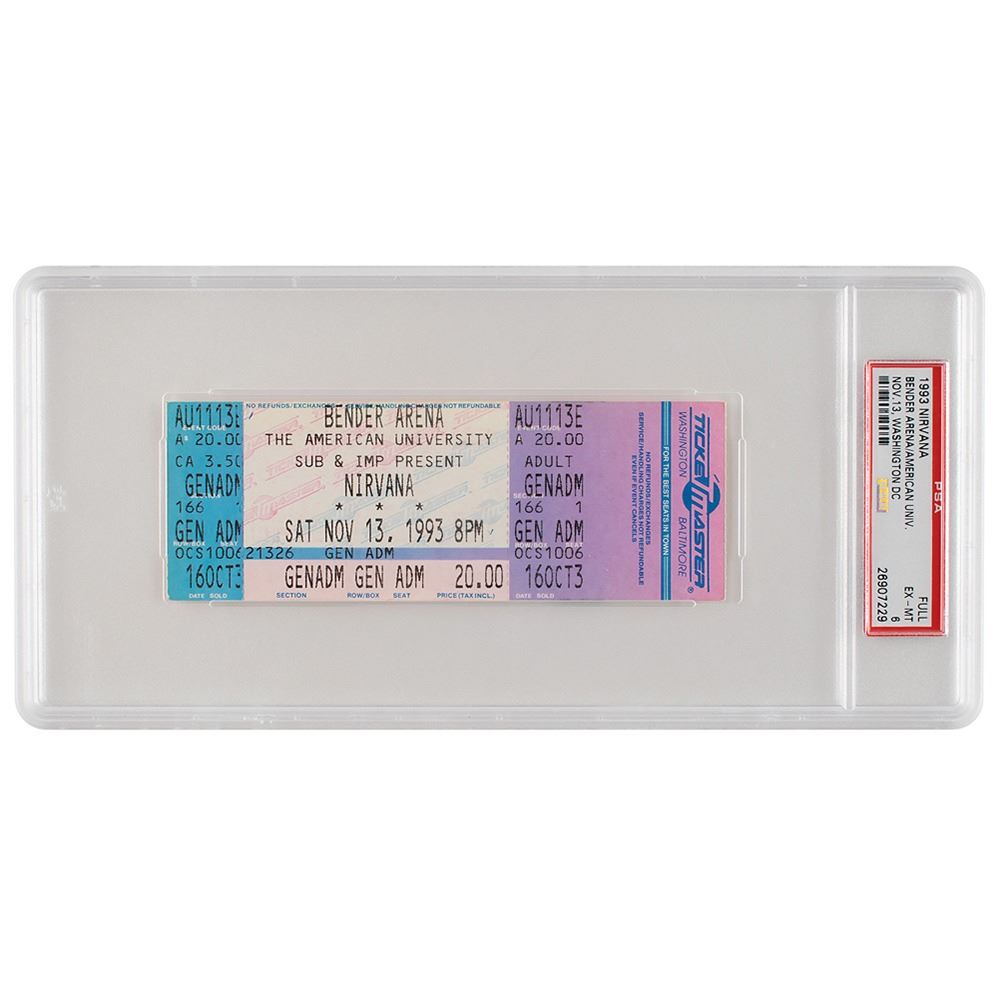 Scarce unused ticket for a Nirvana concert at American University's Bender Arena in Washington, D.C., on November 13, 1993, 5.5 x 2, issued as a general admission ticket. Encapsulated in a PSA/DNA authentication and grading holder, evaluating the ticket as "EX-MT 6."