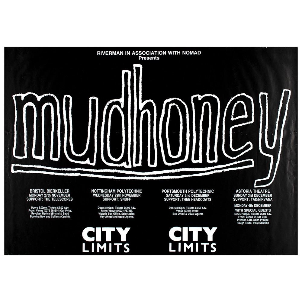 Original 33 x 23.5 poster for a series of Mudhoney concerts in the United Kingdom in November and December of 1988 and 1989, with the Astoria Theatre show on Monday, December 4th listing Nirvana and Tad as the supporting acts. Rolled and in very good to fine condition, with creasing across the center of the poster.