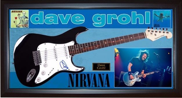 This is a guitar signed by Dave Grohl of Nirvana. This item is custom framed under UV glass and is PSA authenticated. This item is 24 x 42 x 8". This item comes with a Certificate of Authenticity from a third party authenticator. This Certification of Authenticity does not imply that the item will be certified by any other rival authentication companies. The accompanied certification is the only certification the auction company can confirm. These items are being sold as collectable pieces and there is no guarantee that this item can be resold on any online marketplace. Each of these companies has their own policies and politics.