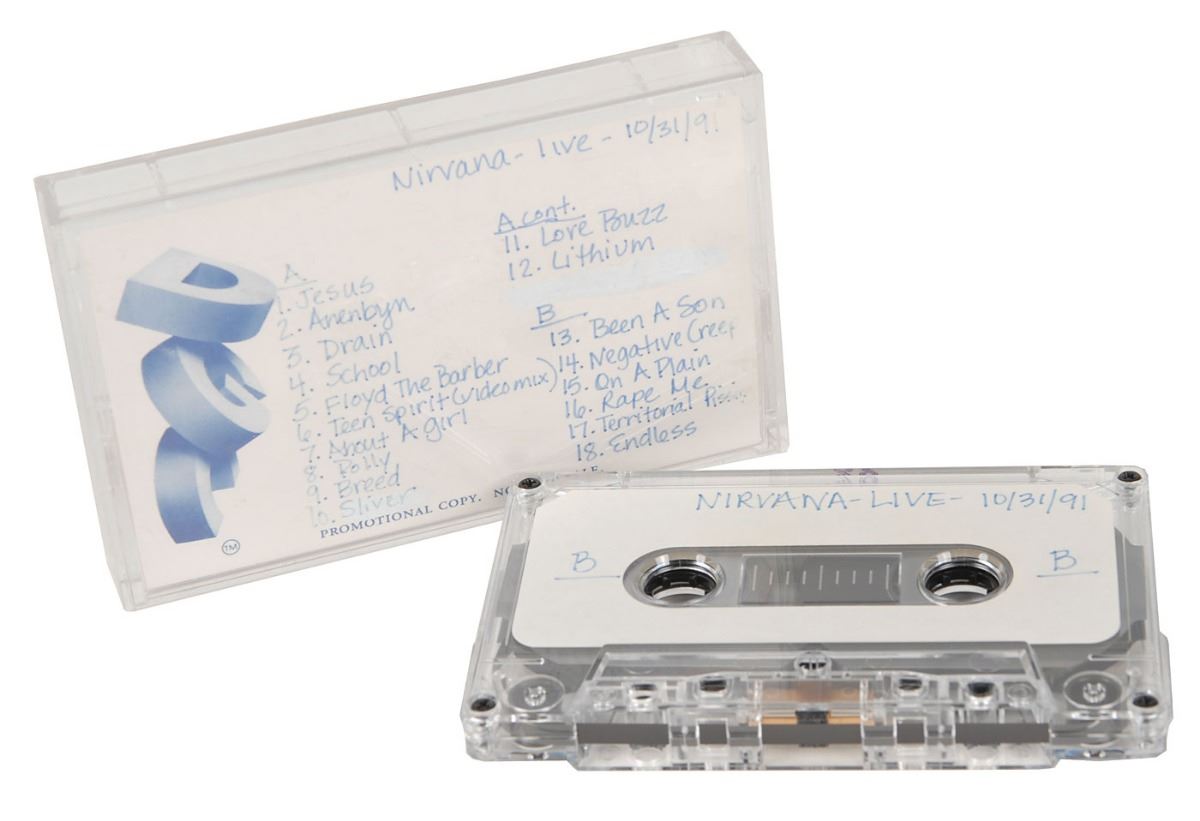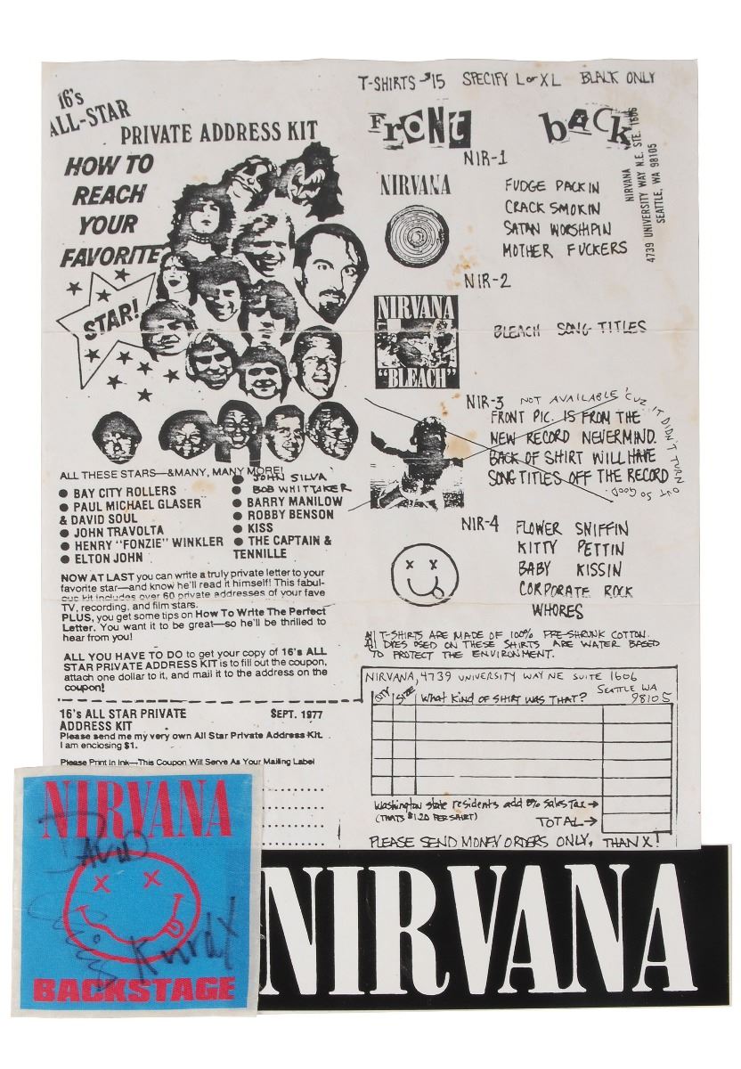 Felt tip signatures, “Kurdt,” “Chris,” and “David,” on a blue-and-maroon 3.25 x 3.5 used backstage pass for a Nirvana concert. Includes a David Geffen Company promotional cassette tape for a Nirvana concert on October 31, 1991, with the front cover listing 18 tracks for sides A and B in an unknown hand, and the the spine reading, “Nirvana–live, 10/31/91, mixed by Andy Wallace.” In fine condition. Also accompanied by a mailing envelope postmarked November 18, 1991, a Nirvana mail order form, and an unused Nirvana sticker. On Halloween 1991, Nirvana performed at the Paramount Theatre in Seattle, Washington, with the footage and audio from the concert released on DVD and Blu-ray in 2011 as part of the 20th anniversary of Nirvana's Nevermind album. Andy Wallace is a Grammy Award-winning studio engineer who has worked on landmark rock and metal albums like Nirvana’s Nevermind, Slayer’s Seasons in the Abyss, and Sepultura’s Arise.